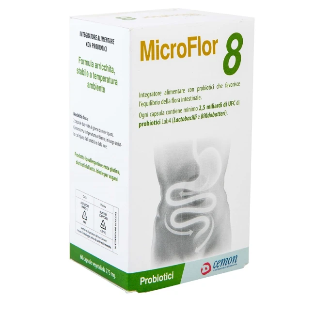 Integratore alimentare con probiotici che favorisce l'equilibrio della flora intestinale.