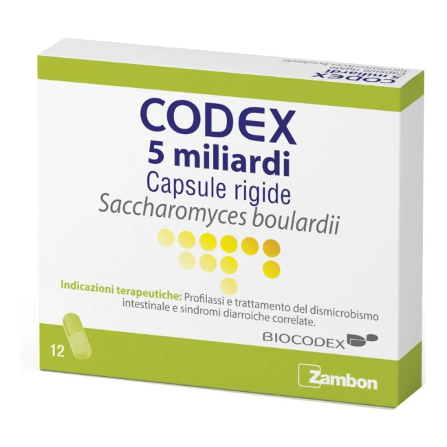 Codex 5 miliardi capsule rigide Ogni capsula contiene: principio attivo: Saccharomyces boulardii 5 miliardi di germi vivi (sotto forma di 250 mg di polvere...