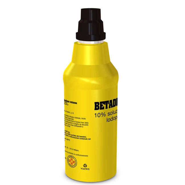AvvertenzeSolo per uso esterno. Questo medicinale non deve essere applicato su cute gravemente lesa e su superfici estese. Non usare per trattamenti prolungati: l'uso specie se prolungato può dare origine a fenomeni di sensibilizzazione. In tal caso, il trattamento deve essere interrotto e deve essere effettuata una valutazione clinica. Particolare cautela va usata in pazienti con preesistente insufficienza renale che necessitino di regolari applicazioni di Betadine su cute lesa (vedere paragrafo 5.2). I pazienti con gozzo, noduli tiroidei o altre patologie tiroidee acute e non acute sono a rischio di sviluppare iperfunzione tiroidea (ipertiroidismo) a seguito di somministrazione di grandi quantità di iodio. In questa popolazione di pazienti, la soluzione di iodopovidone non deve essere impiegata per un periodo di tempo prolungato e su estese superfici corporee. Anche dopo la fine del trattamento bisogna ricercare i precoci sintomi di possibile ipertiroidismo e monitorare la funzione tiroidea. Non usare almeno 10 giorni prima di effettuare una scintigrafia o dopo scintigrafia con iodio radioattivo oppure nel trattamento con iodio radioattivo del carcinoma tiroideo. La popolazione pediatrica ha maggior rischio di sviluppare ipotiroidismo a seguito di applicazioni di dosi elevate di iodio. A causa della permeabilità della cute e della loro elevata sensibilità allo iodio, l’uso di iodopovidone deve essere ridotto al minimo indispensabile nei bambini. Può essere necessario un controllo della funzione tiroidea del bambino (ad esempio livelli di T4 e TSH). Qualsiasi ingestione orale di iodopovidone da parte del bambino deve essere evitata. In età pediatrica usare solo sotto stretto controllo e nei casi di effettiva necessità. L’ingestione o l’inalazione accidentale di alcuni disinfettanti può avere conseguenze gravi talvolta fatali. Evitare il contatto con gli occhi.
