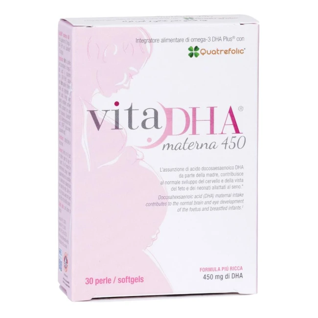 VitaDHA Materna 450 è particolarmente indicato in caso di ridotto apporto di tali nutrienti con l'alimentazione o di aumentato fabbisogno, in particolar modo durante il periodo periconcezionale, in gravidanza e allattamento.