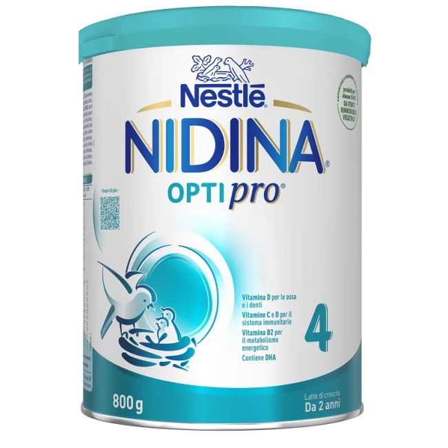 Nestlé Nidina Optipro 4 non è un sostituto del latte materno ma un latte di crescita idoneo all'alimentazione del bambino sano da 24 mesi in avanti. L'allattamento al seno dovrebbe durare più a lungo possibile.