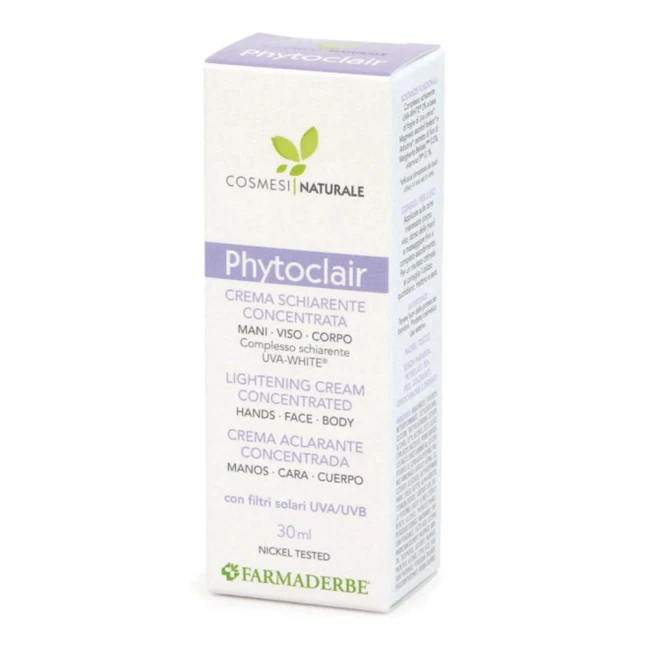 Trattamento intensivo formulato per agire in modo mirato sulle macchie cutanee dovute ad età, acne, cicatrici. Il complesso formato dagli attivi vegetali UVAWHITE estratto di fiori di Margherita, vitamina PP e filtri solari UVA/UVB, regola la produzione di melanina e svolge una efficace, progressiva e duratura azione schiarente contro le discromie prima, durante e dopo il processo di melanogenesi, proteggendo la pelle da ulteriori fenomeni di iperpigmentazione e dal fotoinvecchimento. Dalla piacevole texture fluida e leggera, è indicata anche nella stagione estiva, in caso di cute sensibile ed in gravidanza.