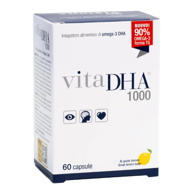 Integratore alimentare di acido docosaesaenoico (DHA Plus) derivato da olio di pesce purificato e deodorizzato per distillazione molecolare multipla. Il DHA Plus di VitaDHA 1000 è altamente biodisponibile perché in forma di trigliceride, struttura facilmente assimilabile dall'organismo. Ogni capsula contiene 563 mg di omega-3 di cui 500 mg di DHA. VitaDHA 1000 è particolarmente indicato in caso di ridotto apporto di tali nutrienti con l'alimentazione o di aumentato fabbisogno.