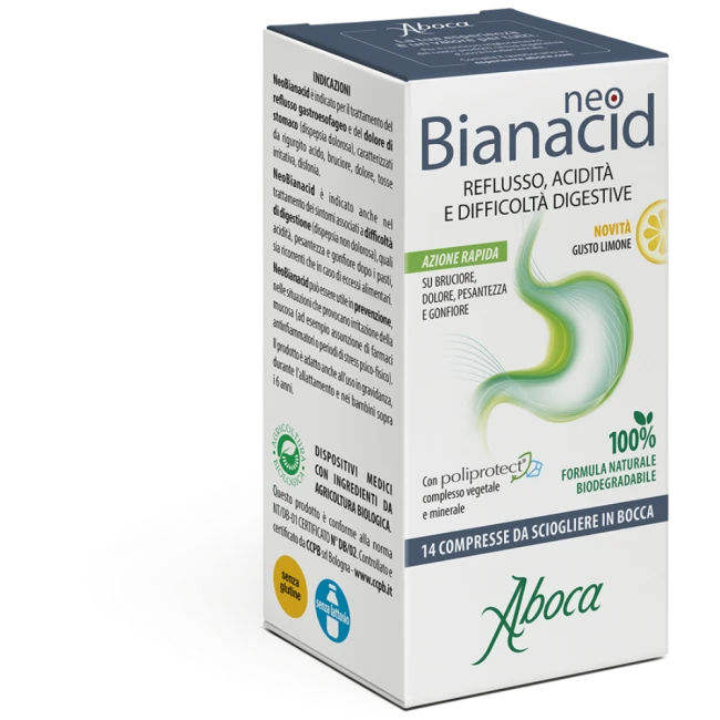 NeoBianacid è indicato anche nel trattamento dei sintomi associati a difficoltà di digestione (dispepsia non dolorosa), quali acidità, pesantezza e gonfiore dopo i pasti, sia ricorrenti che in caso di eccessi alimentari.