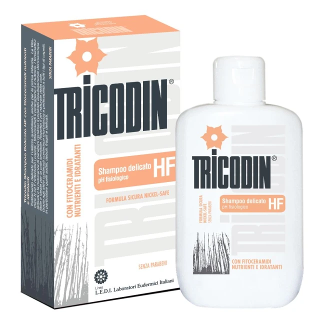 Shampoo delicato per lavaggi frequenti, anche per la prima infanzia. Detergente del cuoio capelluto dotato di elevata affinità alla fisiologia cutanea. La presenza di un derivato aminoacido, quale il sale di tea, rende la formulazione di elevata eudermia cutanea con bassissimo potere irritante per le mucose. Le vitamine H e F, coinvolte dell'attività follicolare, rinforzano i capelli. I fitoceramidi-6 proteggono e nutrono la cuticola con attività idroregolatoria. Insieme sono un orchestrato apporto di nutrienti che fanno del Tricodin HF Delicato uno shampoo ideale per uso frequente, anche quotidiano. I tensioattivi delicati a base vegetale e la mancanza di parabeni rendono il prodotto assolutamente dermocompatibile e ideale per la cute sensibile. Conferisce morbidezza e pettinabilità a tutti i tipi di capelli, in particolare a quelli sottili, deboli, fragili e delicati.Antielettrostatico. Senza parabeni. Testato per garantire la massima tollerabilità per i soggetti sensibili al nichel (nichel inferiore a 0,001%).