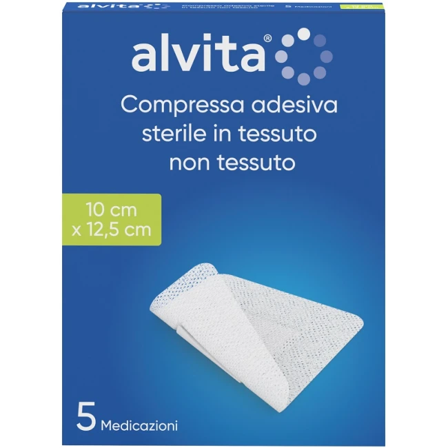 Compressa adesiva sterile in tessuto non tessuto composta da un supporto adesivo in tessuto non tessuto, al centro del quale è posizionato un tampone assorbente che non aderisce alla pelle.