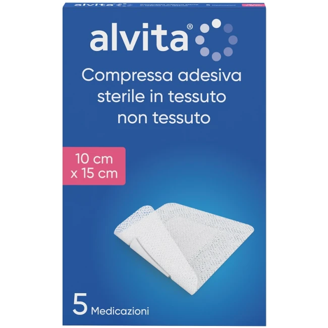 Compressa adesiva sterile in tessuto non tessuto composta da un supporto adesivo in tessuto non tessuto, al centro del quale è posizionato un tampone assorbente che non aderisce alla pelle.