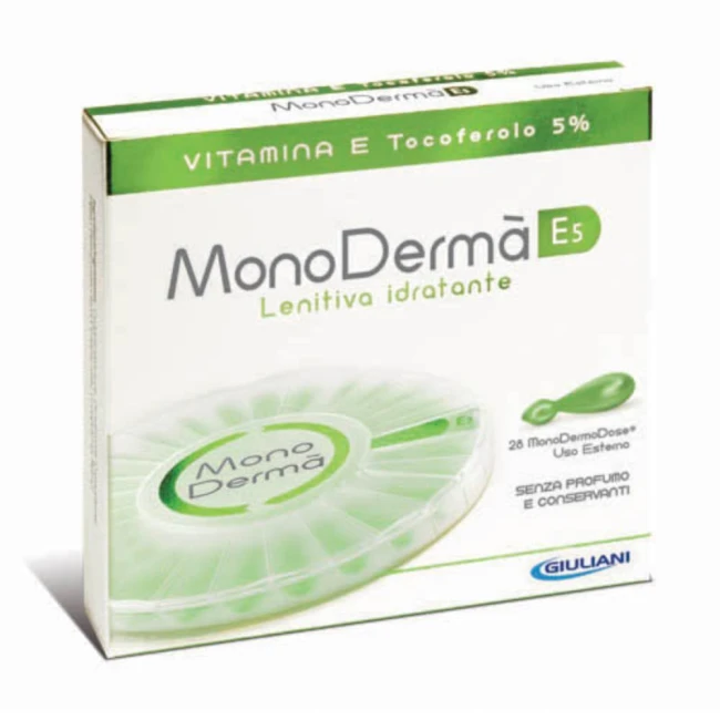 Prodotto dermatologico contiene vitamina E pura di origine naturale alla concentrazione del 5%. La vitamina E rappresenta un fattore nutritivo essenziale ed indispensabile per le funzioni della pelle. La cute, a causa di un’eccessiva produzione di radicali liberi, è sottoposta a diversi tipi di stress ossidativi per cause sia esogene che endogene; la vitamina E pura di derivazione naturale migliora l’attività dei sistemi antiossidanti locali contrastando i danni provocati dall’azione dei radicali liberi, contrasta i processi infiammatori, svolge un’efficace azione idratante e lenitiva, alleviando il prurito, oltre a proteggere dai danni del fotoinvecchiamento (eccessiva esposizione ai raggi solari, lampade UV). La monodermodose consente di avere una formula essenziale, sicura e ben tollerata dalla pelle, grazie alla totale assenza di conservanti e profumo.