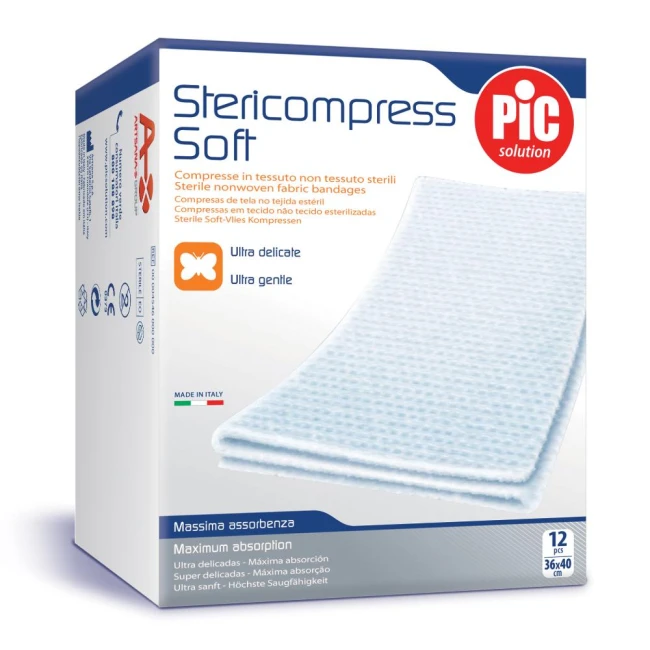 compresse dalla speciale composizione in tessuto non tessuto (viscosa e poliestere), ipoallergeniche e particolarmente delicate a contatto con l’epidermide.