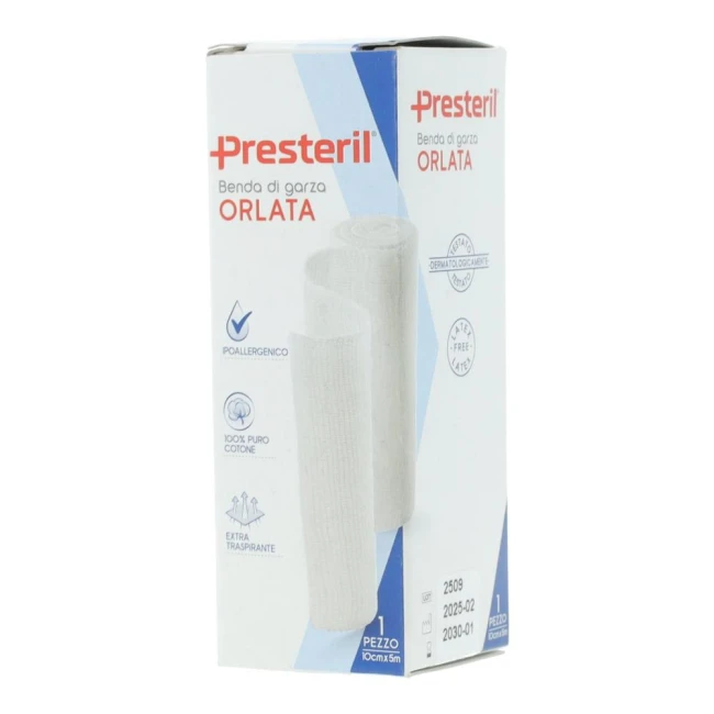 Applicare la fasciatura alla zona interessata esercitando una buona pressione; quindi fissare la benda con rocchetto mediPresteril.