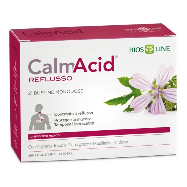Indicazioni: CalmAcid Reflusso contiene Alginato di sodio, Argilla bianca, Fieno greco (estratto ricco in galattomannani) e mucillagini di Malva; è formulato per contrastare il reflusso, proteggere le mucose gastro-esofagee e tamponare l'iperacidità di stomaco riducendone i sintomi correlati come sensazione di rigurgito, esofagite, pirosi, tosse, flogosi rinofaringea, disturbi dovuti al reflusso gastro-esofageo. Dolcificato con Stevia.