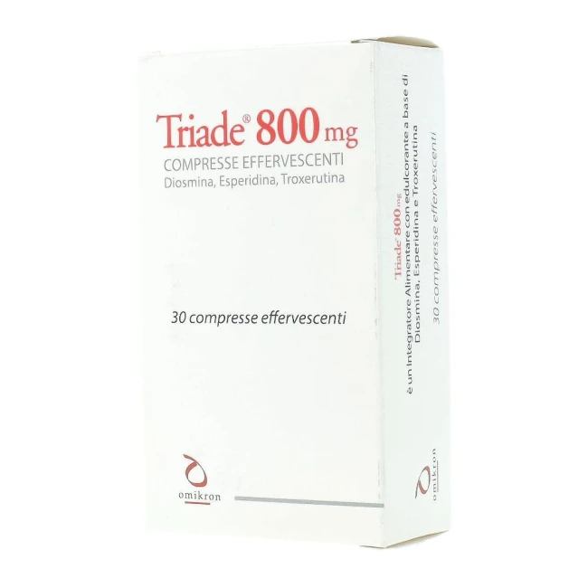 Integratore alimentare a base di diosmina, esperidina e troxerutina. I nutrienti contenuti in Triade 800 mg possono contribuire ad assicurare un apporto integrativo di flavonoidi alla dieta. Triade 800 mg è formulato per fornire un aiuto razionale e naturale come coadiuvante ad una corretta alimentazione nei soggetti con alterazioni dei meccanismi fisiologici a livello capillare, vascolare e tissutale. Grazie alla specifica formulazione in compresse effervescenti e al dosaggio dell’esperidina, Triade 800 mg è utile come coadiuvante nella flebopatia ipotonica costituzionale e, in particolare, nell’Insufficienza Venosa Acuta, garantendo un immediato miglioramento della sintomatologia dolorosa.