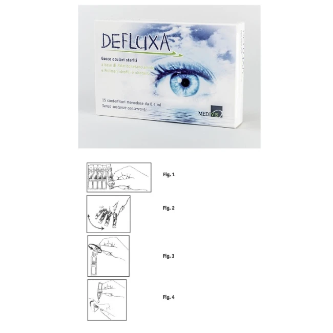 DEFLUXA è una soluzione oftalmica sterile, isotonica a pH fisiologico costituita da palmitoiletanolamide (molecola di natura Lipidica), da polimeri idrofili ed idratanti (acido ialuronico sale sadico, polivinilalcole e ciclodestrina), da glicerolo (molecola ad azione umettante e osmoprotettiva) e da sali minerali.