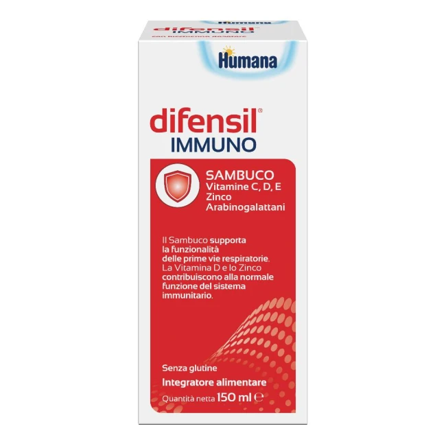 Acqua depurata, fruttosio, acido L-ascorbico, succo di sambuco (sambucus nigra l.) frutto, acetato di DL-alfa- tocoferile, bisglicinato di zinco; conservanti: sorbato di potassio, benzoato di sodio; addensante: gomma di xanthan; arabinogalattani; fermenti non vitali: lactobacillus acidophilus tindalizzato HA 122 (BCCM/LMG ID11272)* (può contenere tracce di latte, soia e loro derivati), colecalciferolo.